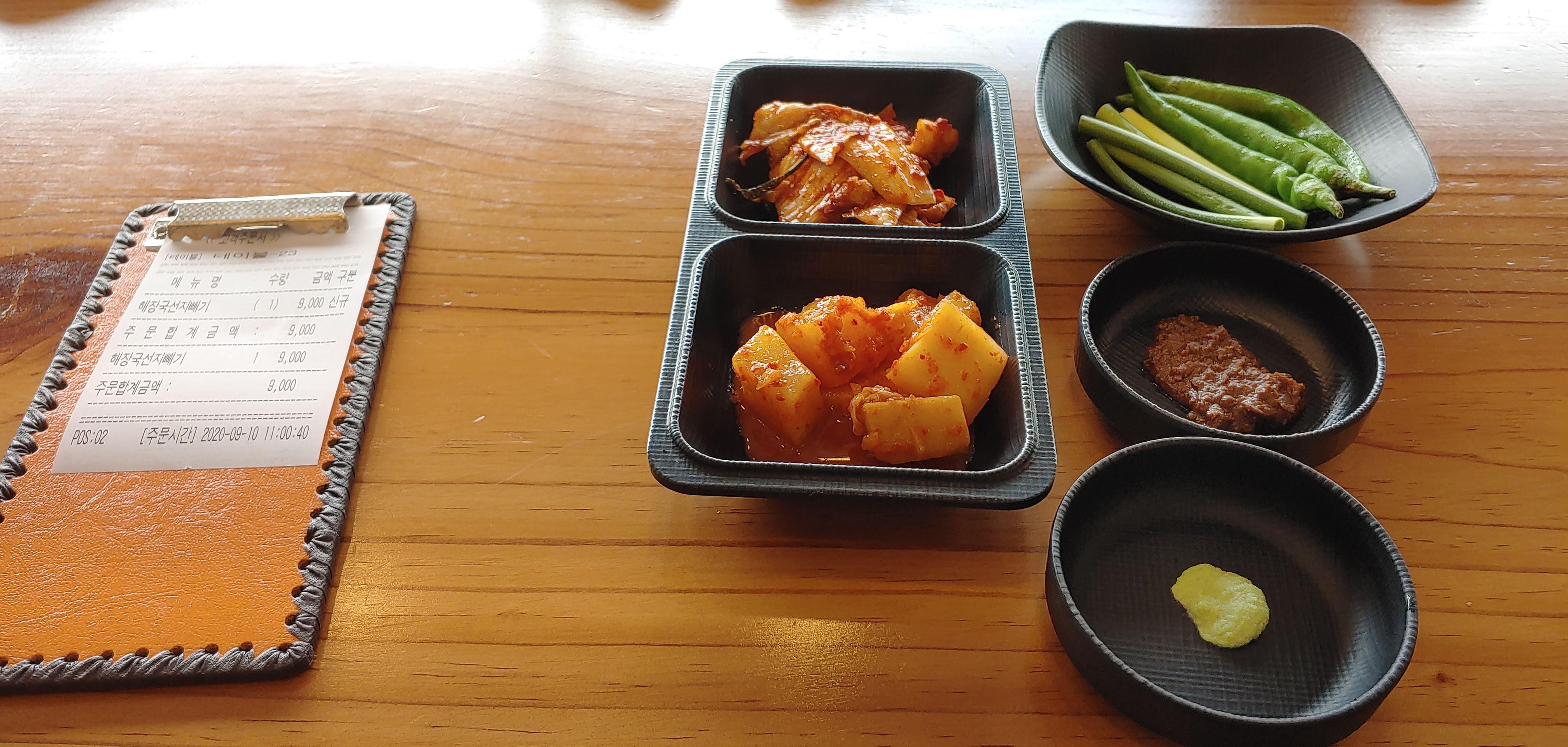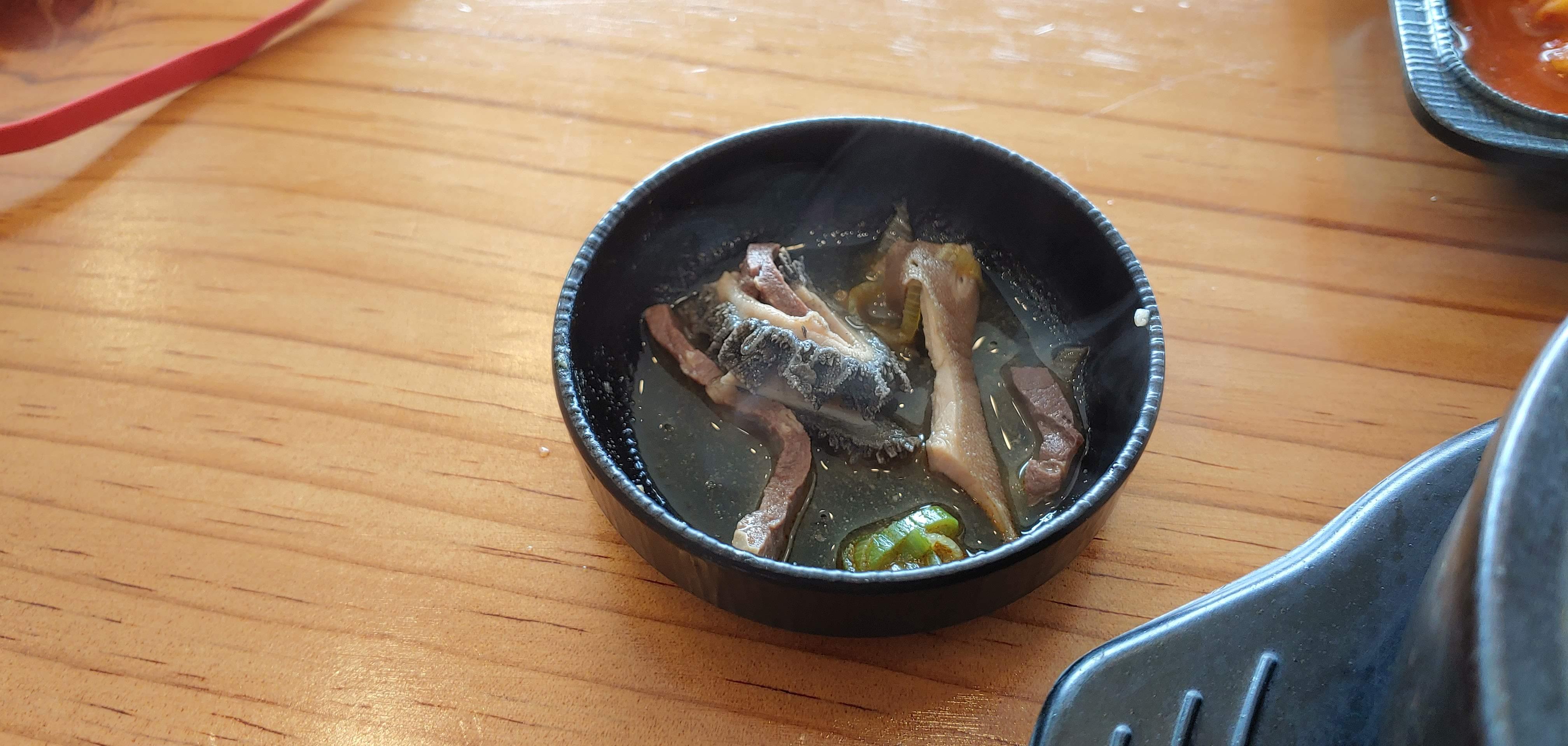 양은 이렇게 간장 + 와사비에 찍어 드시면 좋아요. 일반 해장국과는 많이 다른 비주얼을 가지고 있으면서 국물맛 진하고 맛있습니다.
