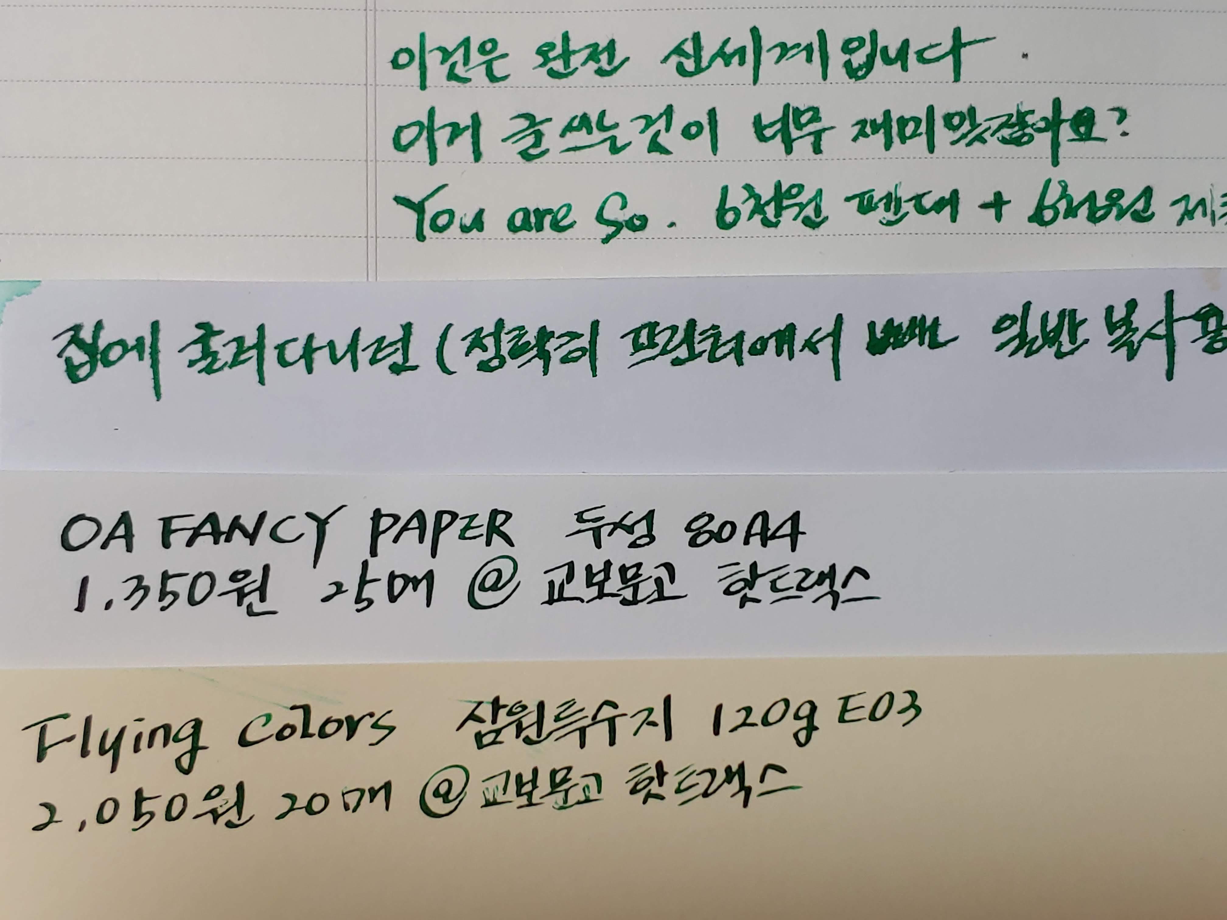 이 정도만 되도 일반 70g 짜리 복사용지와는 엄청나게 다른 종이 질감을 보여준다. 같은 펜을 일반 종이에 썼을 때와 OA FANCY PAPER 에 쓴 것이 많이 다르다. 잉크 색감도 다르고 번짐도 다를 뿐 아니라 필기감도 두성 것이 매우 좋다.