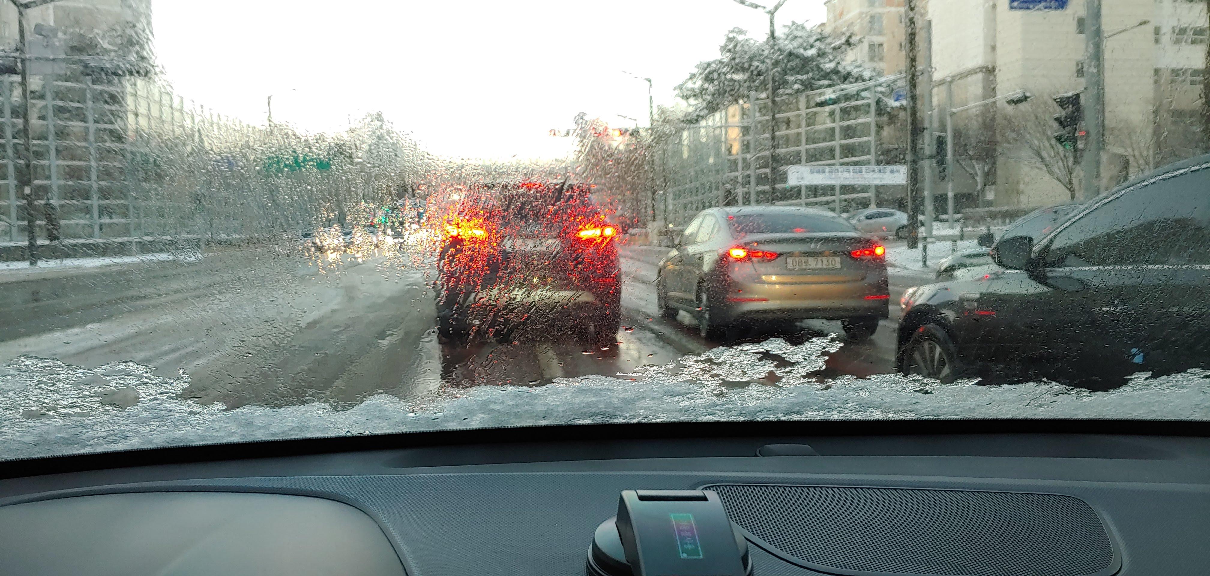 아뿔싸. 와이퍼가 얼어붙어 안 움직일 줄이야. 열심히 손으로 닦아가며 출근.