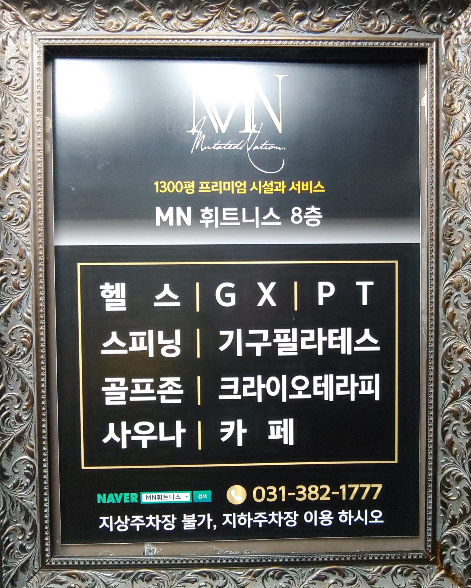 엘리베이터안에 걸린 MN휘트니스 액자.