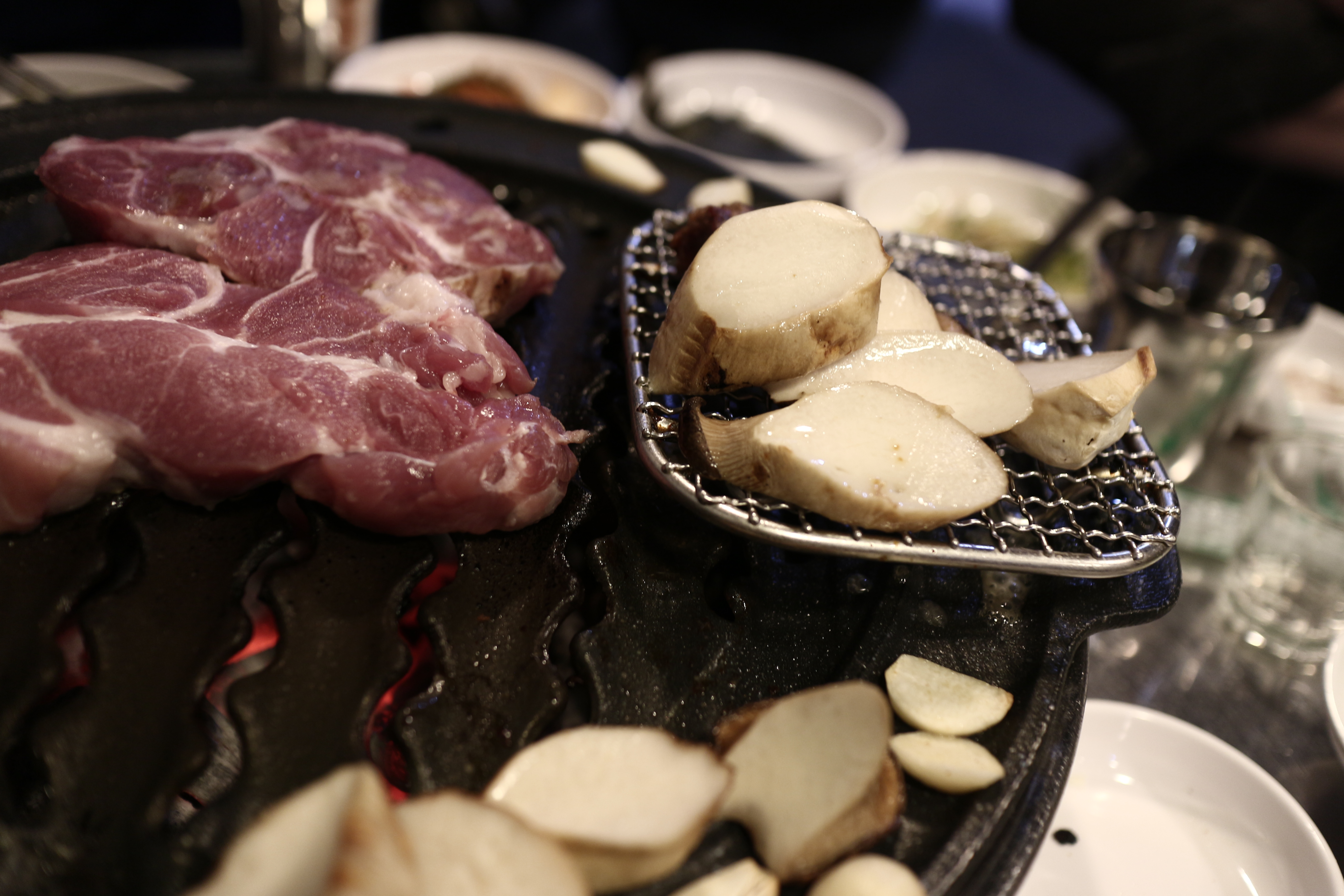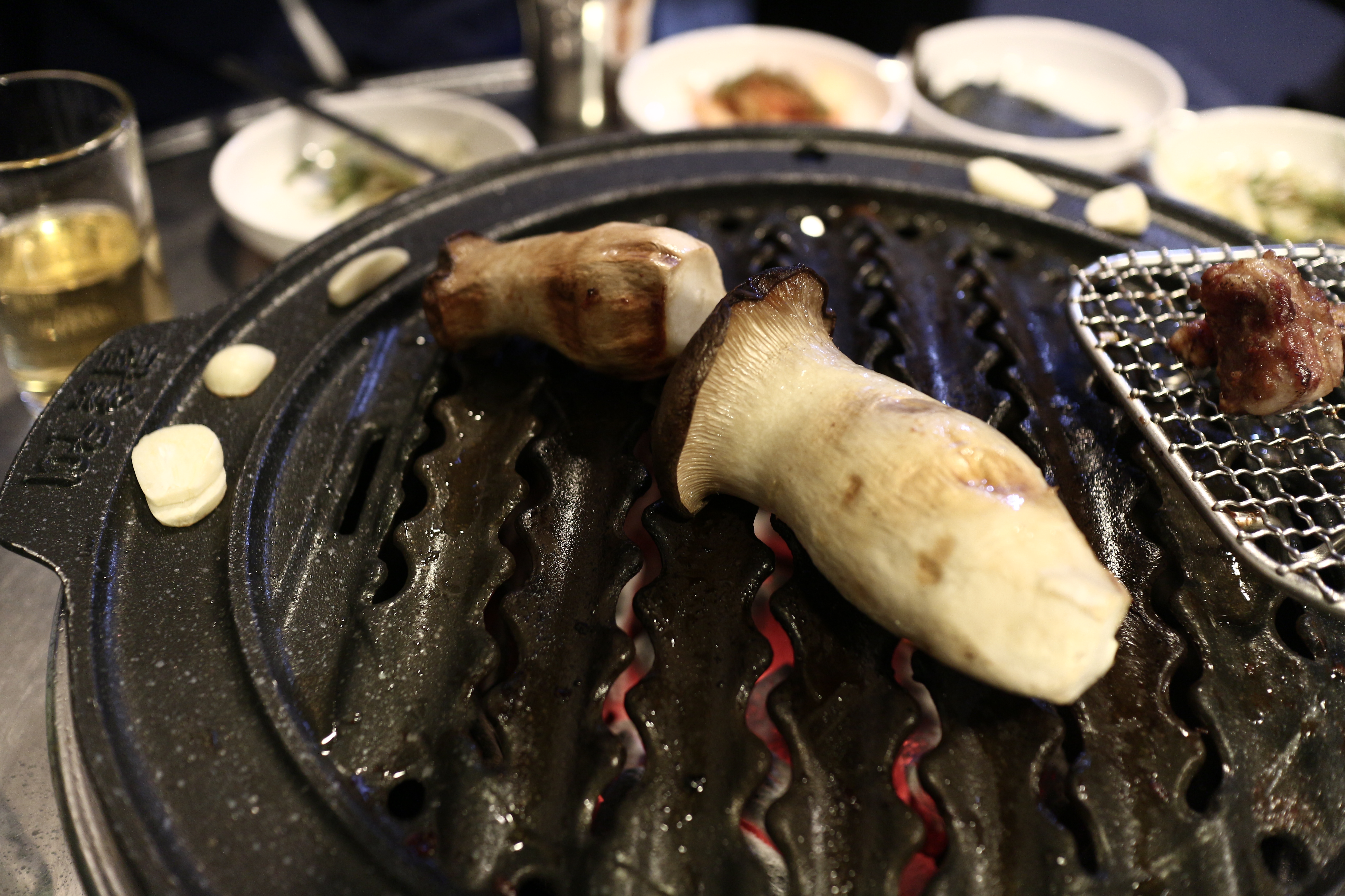 그렇다. 버섯을 통째로 충분히 잘 구워야 안의 즙이 간직되서 맛있다는 말씀. 이렇게 가만 두면 사장님이 오셔서 잘라 주신다. 버섯도 살아있구나.