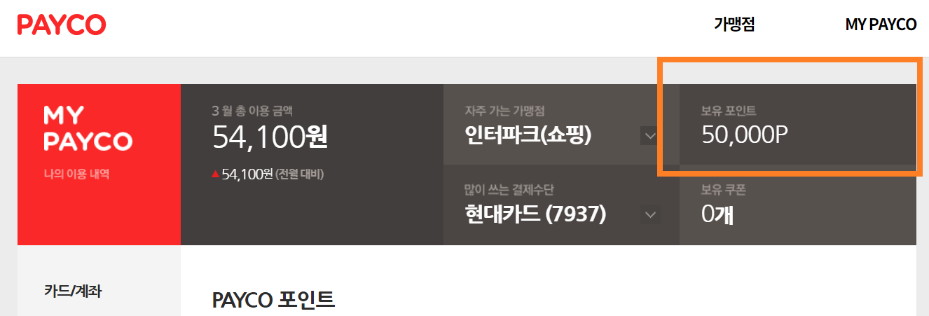 포인트로 5만원 차감되고 나머지 잔액 4천원은 페이코 결재에 연동된 카드로 되겠지.