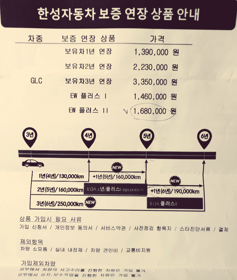 이렇게 벤츠는 3년 무상 보증 + 2년 연장(추가비용) + 1년 연장(추가비용) 이렇게 도합 6년간 보증 수리를 받을 수 있다.