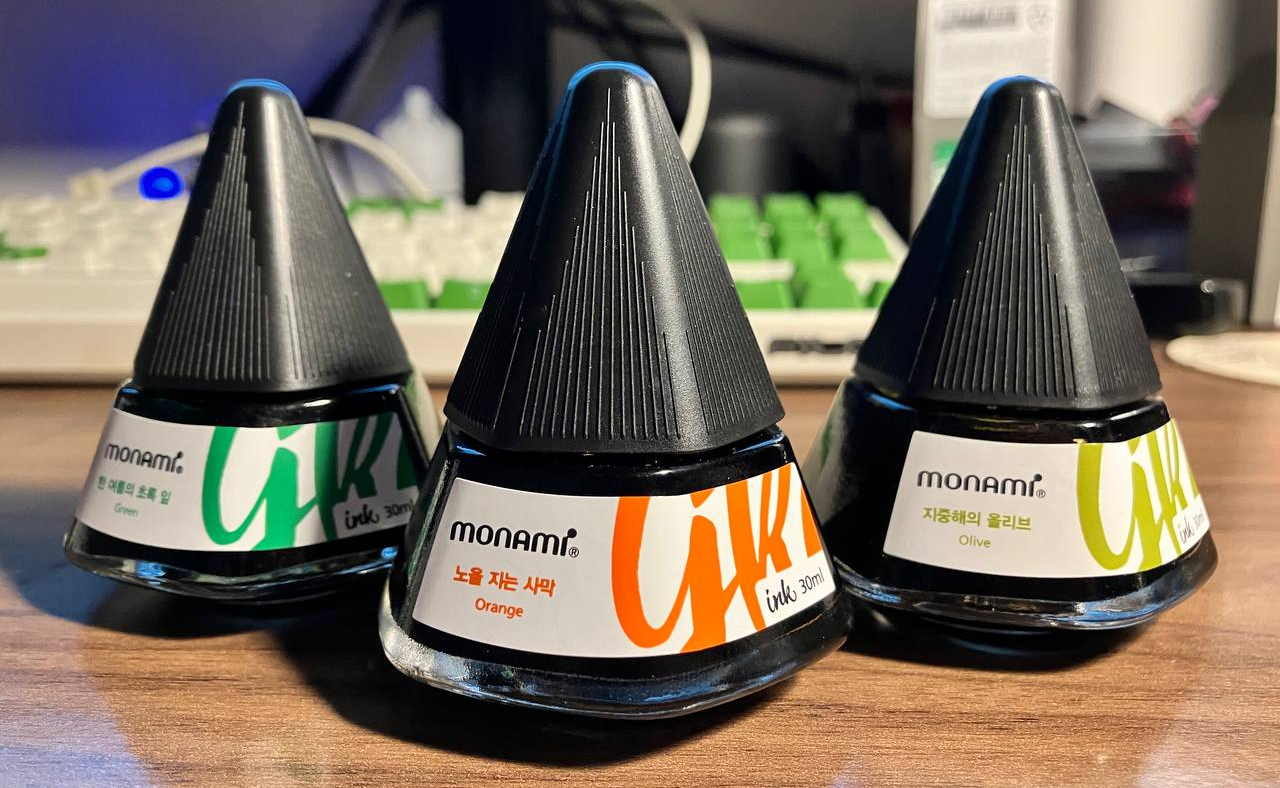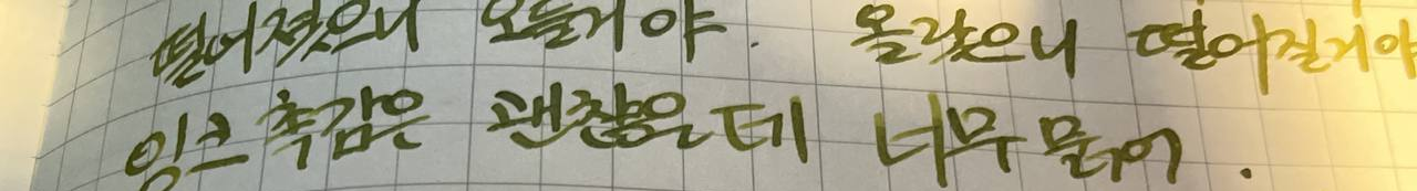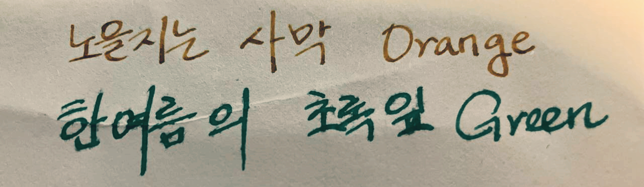 대상 색상이 명확합니다. Orange는 사용된 만년필에 이전 검정 잉크의 흔적이 있어 좀 더 진하게 나온 편이고 Green은 그대로 나왔습니다.