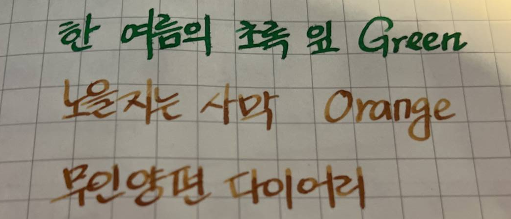 대상 색상이 명확합니다. Orange는 사용된 만년필에 이전 검정 잉크의 흔적이 있어 좀 더 진하게 나온 편이고 Green은 그대로 나왔습니다.