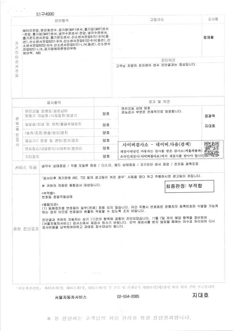 문제는 불합격. 뒷 쪽 번호판 조명등 2개 중 왼쪽 1개가 안 들어옵니다.