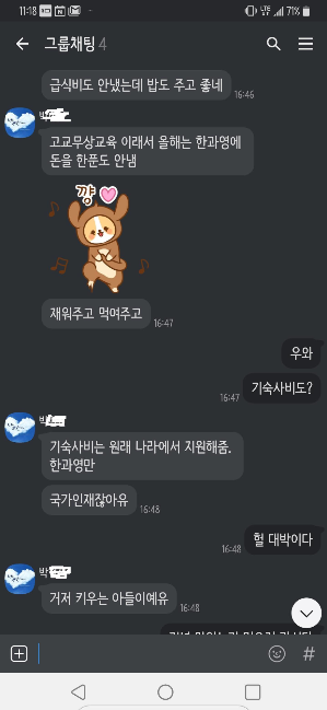 급식비, 기숙사비는 전부터 나라에서 지원해주는 학교다 보니 이젠 학교에 돈 들어가는 것이 하나도 없는 상상도 못하던 놀라운 일이 벌어진거에요. 오죽하면 아내가 '거저 키우는 아들' 이라고 합니다.
